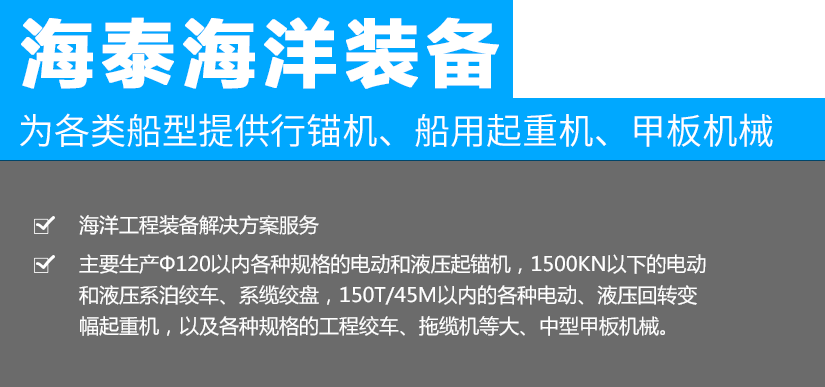 江蘇海泰海洋裝備有限公司位于素稱“銀杏之鄉”的泰興市,2018年投資建設,至今已經成為產品研發、生產制造,調試服務為一體的設備配套企業。公司從事海洋裝備(設備)及配件的制造、設計、安裝,維修;船用錨機、絞車、起重機、舾裝件、電氣設備、環保設備設計、制造。公司成立以來,就與中國船舶工業集團公司第701所、702所、704所、708所、上海船舶研究設計院等多家船舶科研院所建立了技術合作關系,產品應用于......